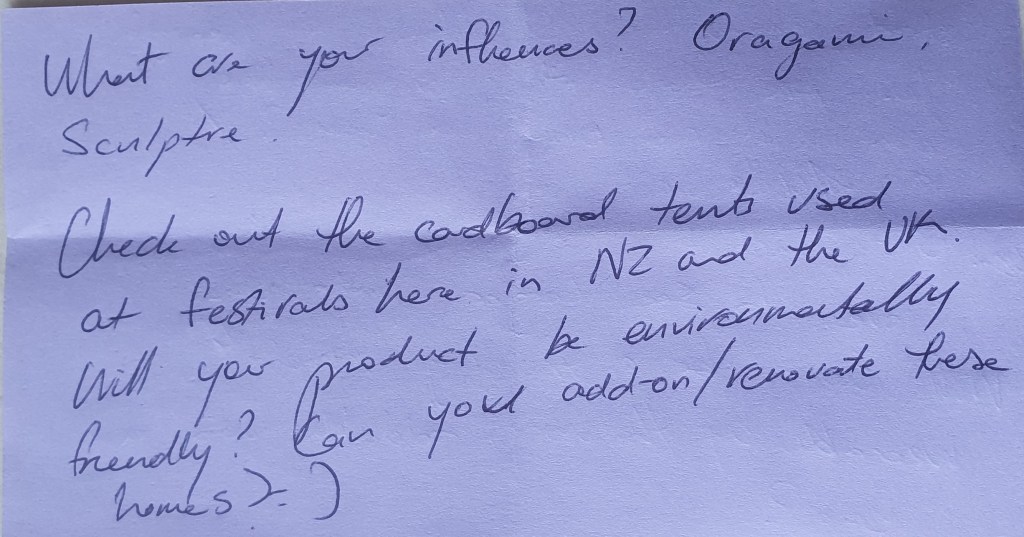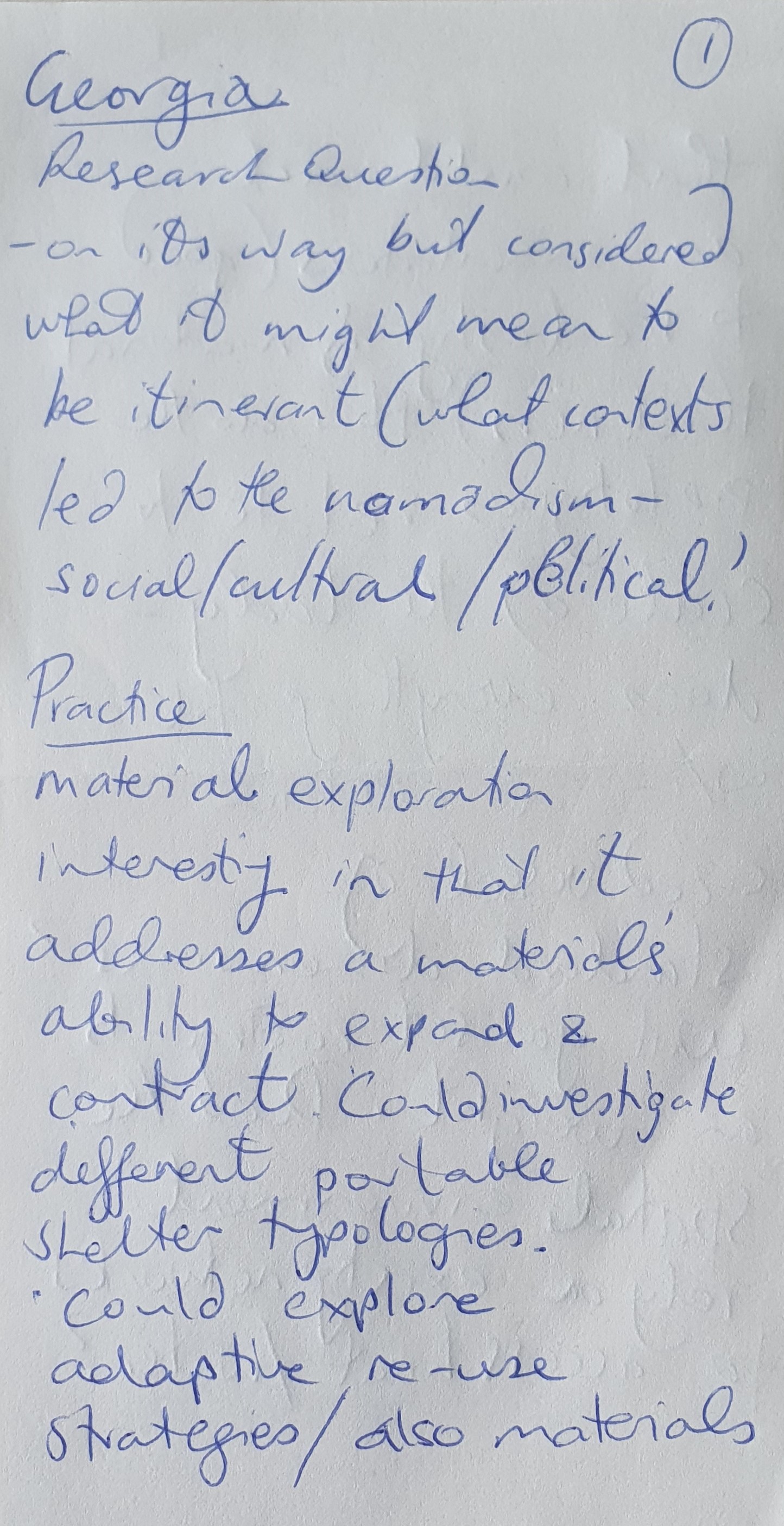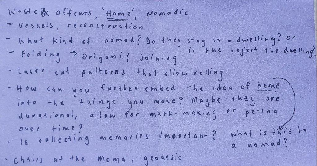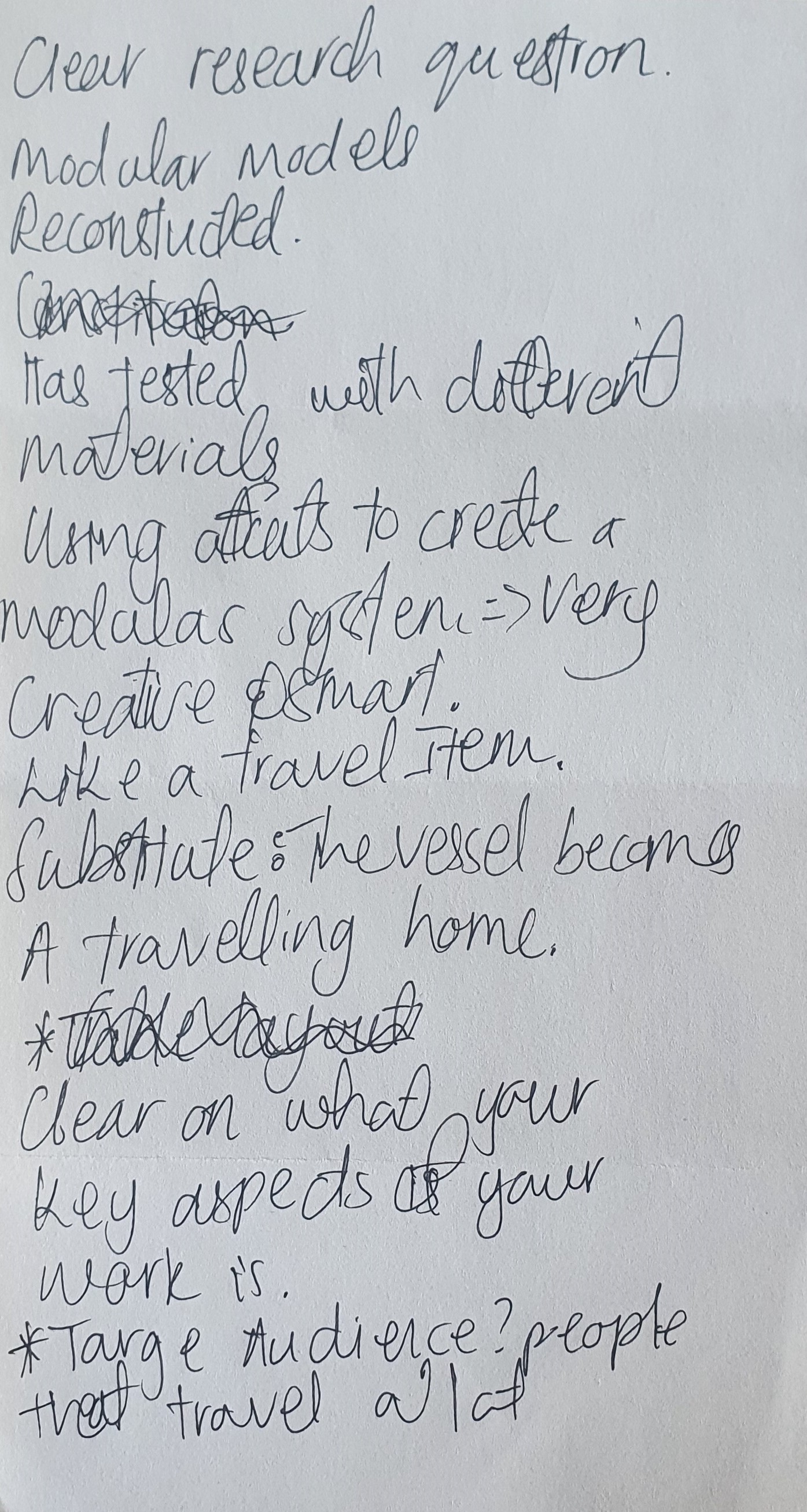 I had a lot of feedback about my current research question (How can waste and offcut materials be used to create light weight modular “homes” for a nomadic person?) and how this needs to be fleshed out more to help narrow down and add specifics to what it is I am researching and what my research area encompasses. Helping me think about the political, cultural, social and historical values that underpin my research.