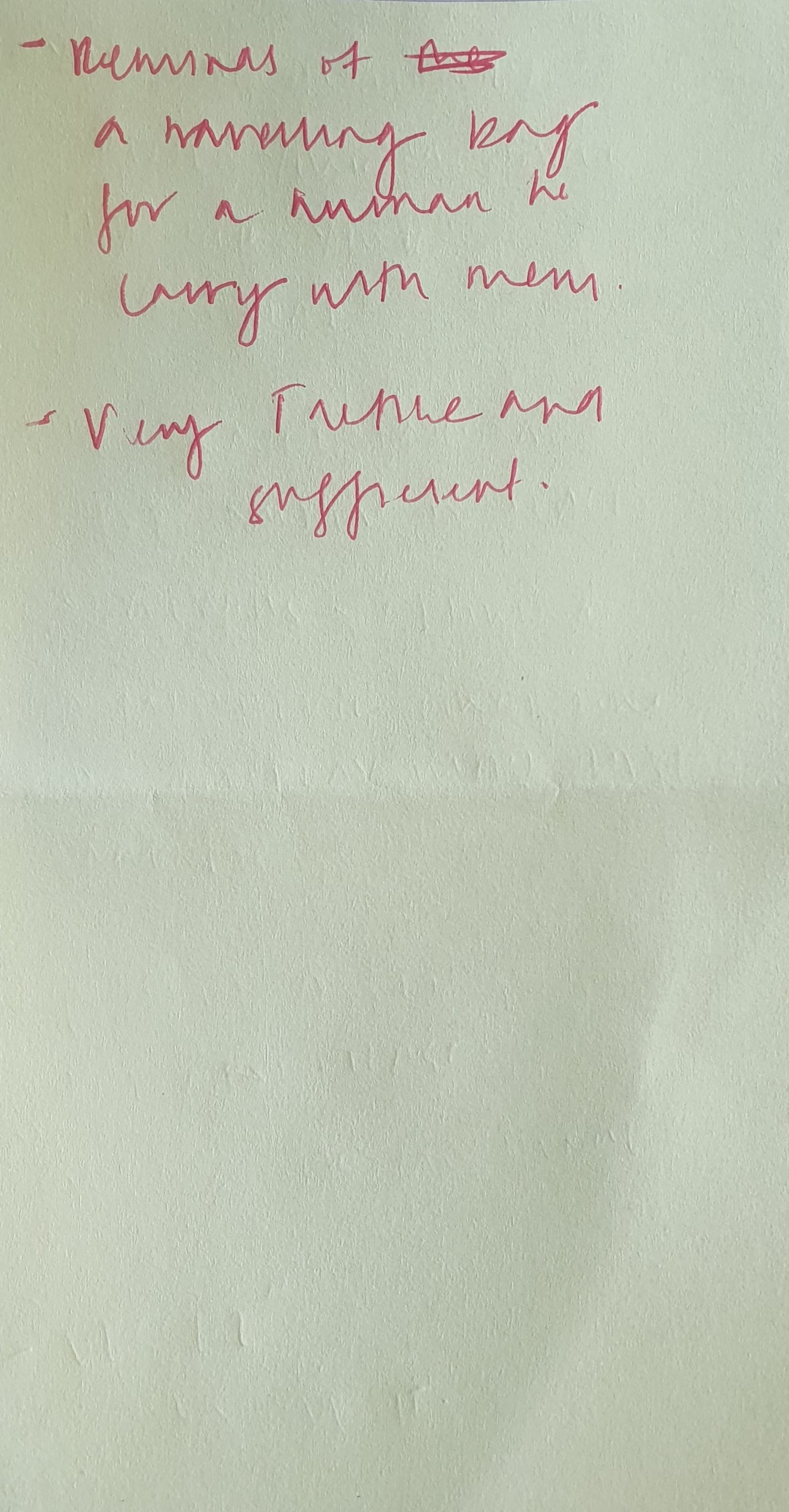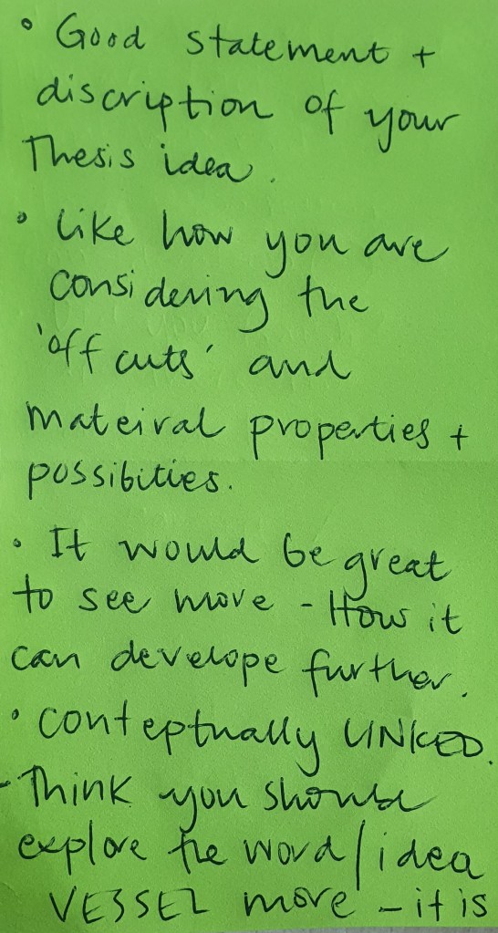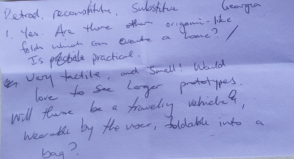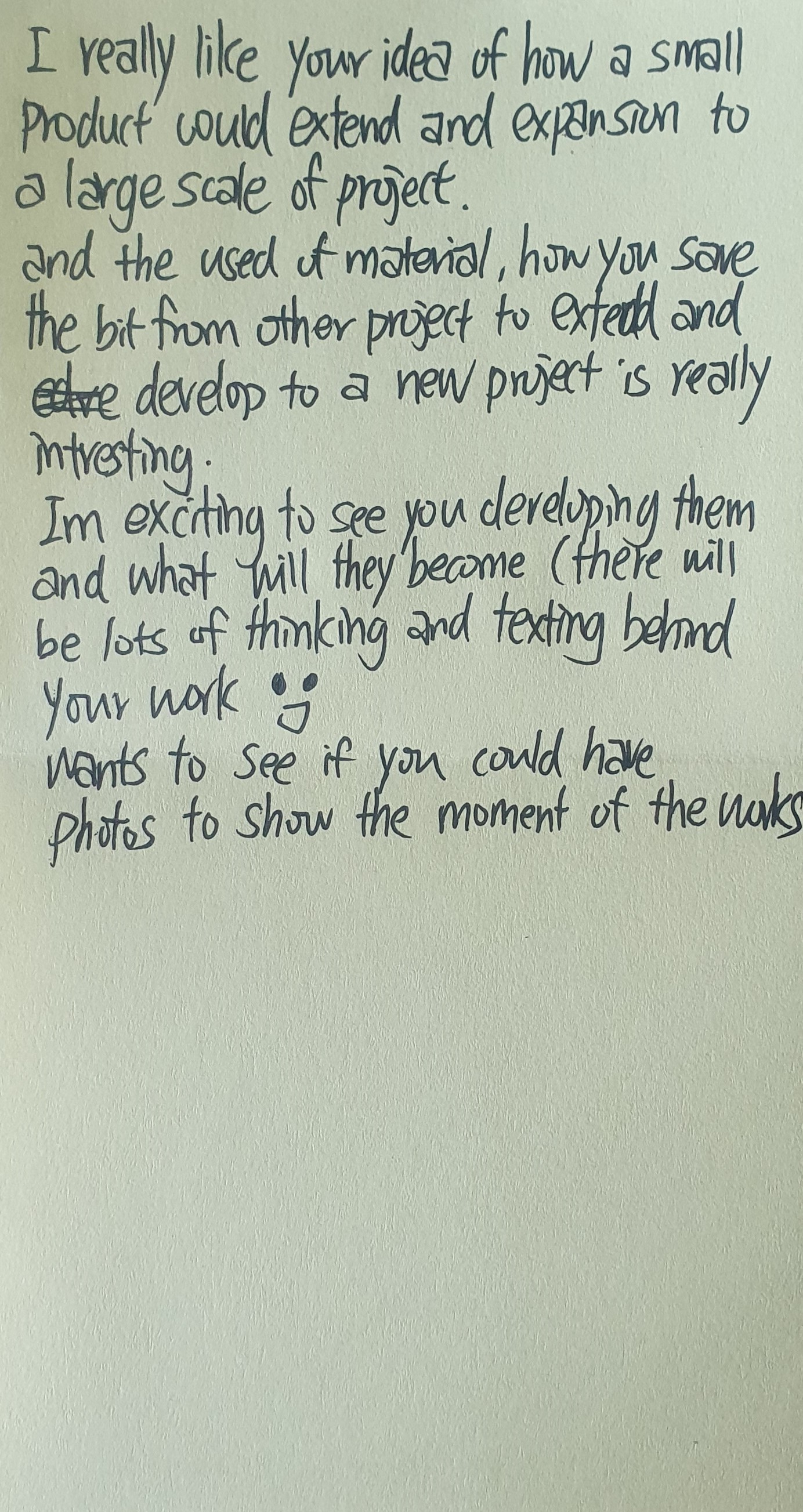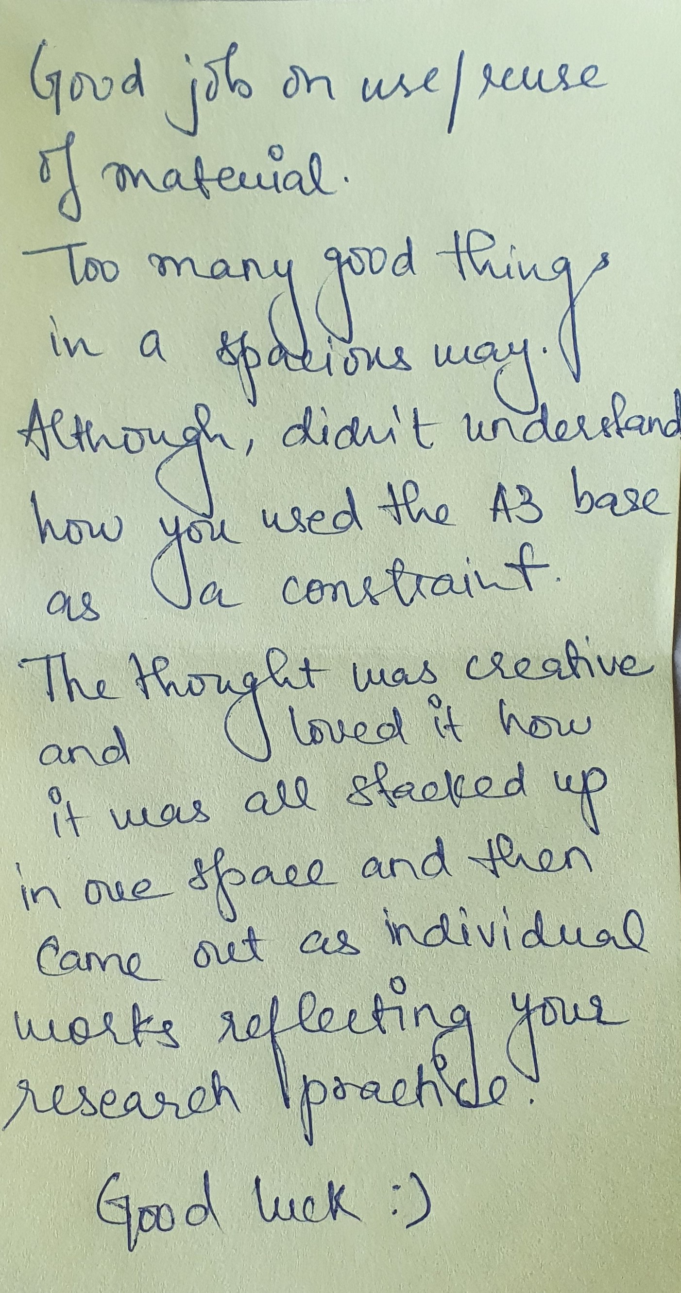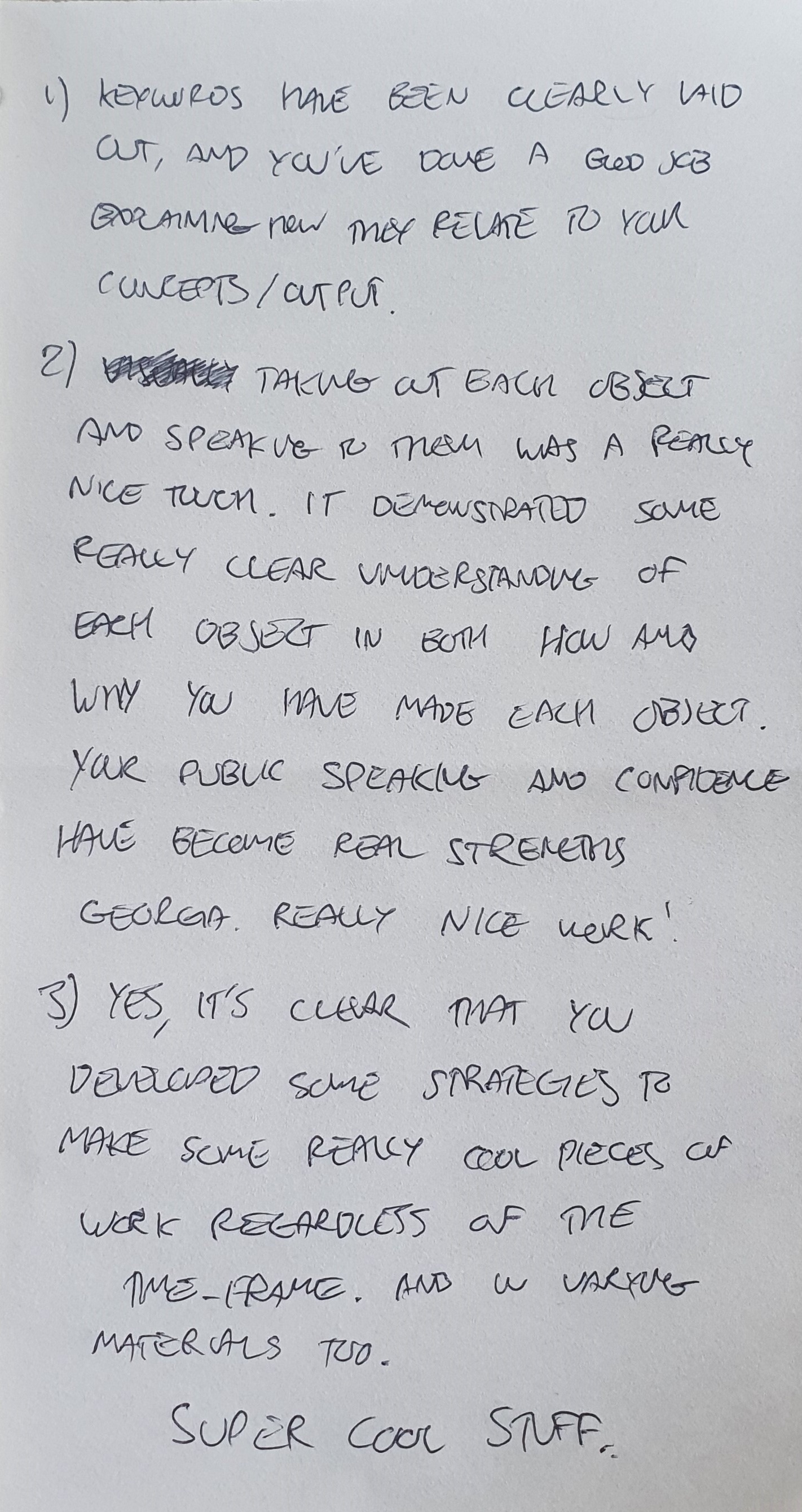 We laid out our work to present in the class and we did a somewhat silent critique session for our upcoming formative assessment. Presenting our 200 word statement and a brief explanation of the models we have created. The rest of the class were then asked to write down their feedback on pieces of paper and put these into an envelope next to the persons work. This feedback is positive and constructive feedback that the person can use to generate more ideas taking their project forward.