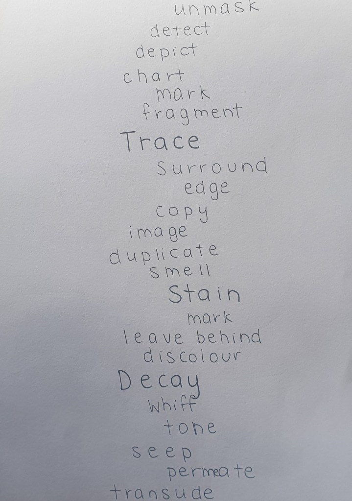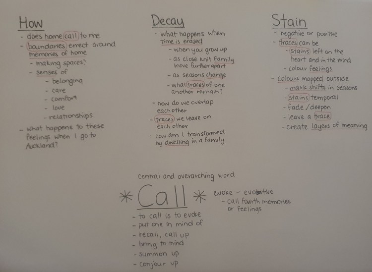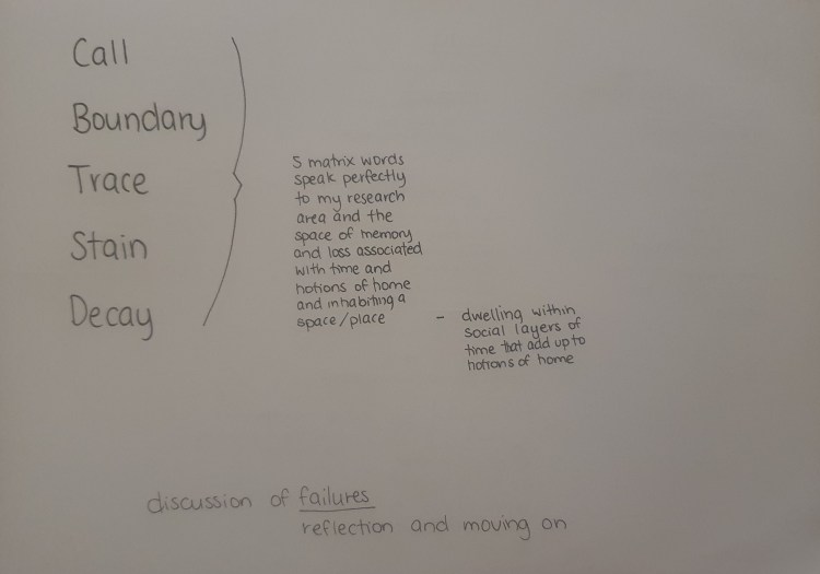 - However, they are also very easily translated into the research that I am interested in pursuing to find out and look into what it is about the 5 senses that make us feel at home, and draw out memories and trigger thoughts when we experience these senses again. How memories are made through the things that we interact with on a much more intimate scale. My 5 chosen matrix words (call, boundary, decay, stain, and trace) speak very strongly to the research I am interested in pursuing. Creating strong connections with the space of memory and loss associated with time and ideas of home, inhabiting a space/place. The idea of inhabiting social layers of time whether that is seasonal, family interactions moving apart, temporal attachments, traces left on each other, these all add up to the notions of home and how we experience this.