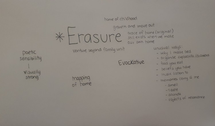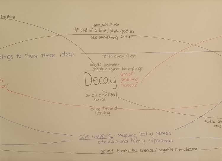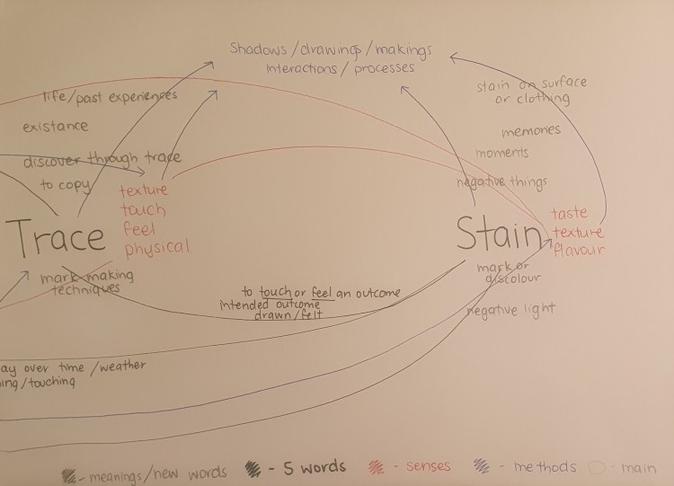- words and writing is something that I have always struggled with a lot and it seems to be becoming an increasing issue the more attention and focus I put into a piece of writing to polish it up and make is sound exactly how it does in my head to get across my ideas. even though this is a struggle a way I have found to get around this initial confusion is to list down in bullet points all of the ideas that I am thinking of and then once all of these ideas are written down so I don’t forget I can start to arrange them into a visual map. starting by laying out the main and overarching ideas on a piece of paper and layer by layer adding more context to the page and using arrows and different coloured pens to form connections across the different ideas and how these ideas could relate to one and other. these connections can be through a key word or theme, a method or even a written or visual context.