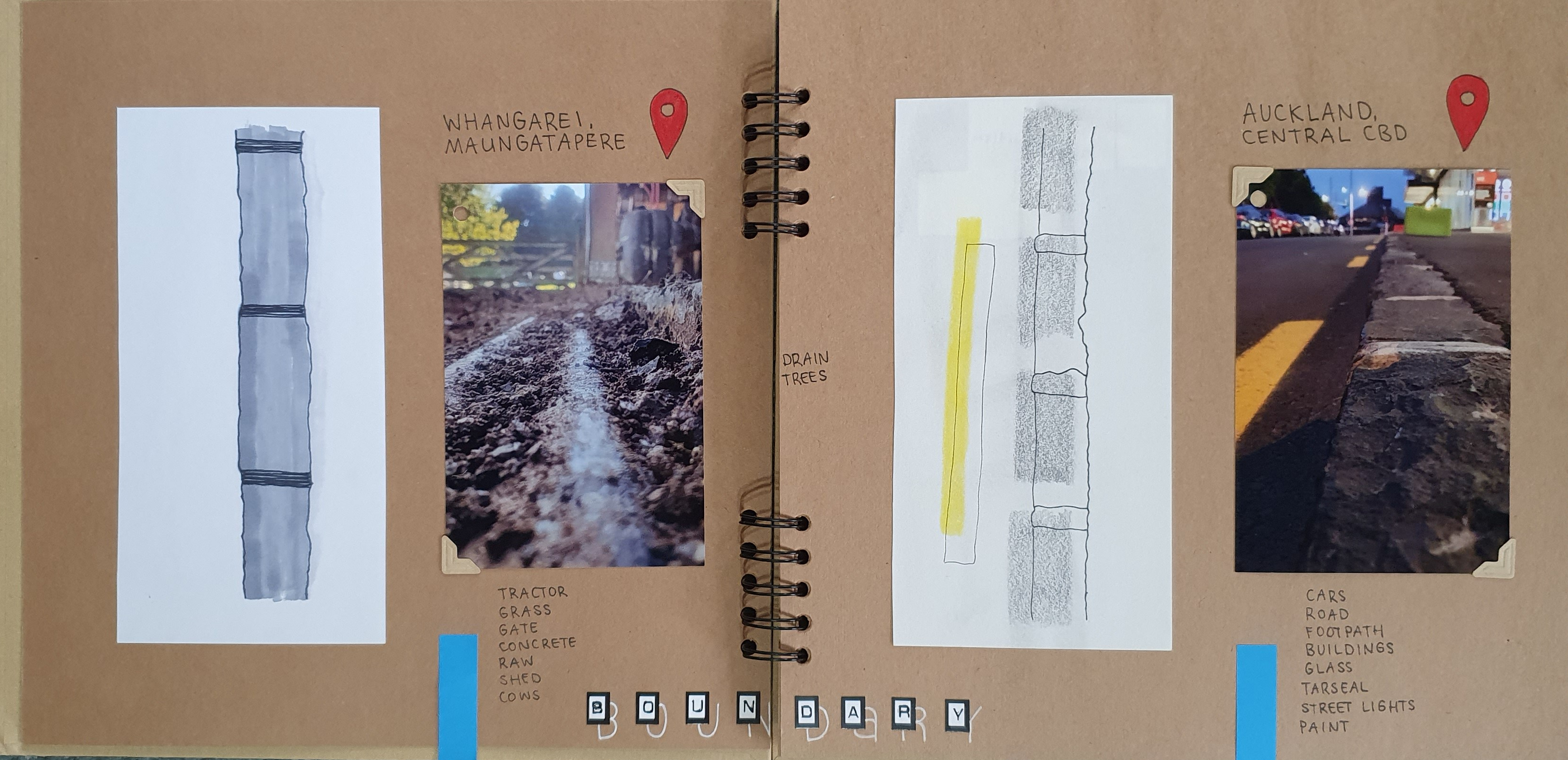 Down the centre of the page a boundary line is drawn, creating a divide, a discontinue between the country and the city. To show transition from one location to another through the use of concrete, gravel, and dirt we progress to the city.
