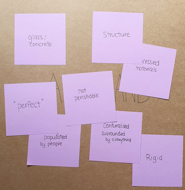 | Glass/concrete Structure Processed materials “perfect” Not perishable Heavily populated by people Centralised surrounded by everything rigid | Highlight artworks/works grid white walls order square box “perfect” strategic/thoughtful layout Clean/crisp display/dont touch |