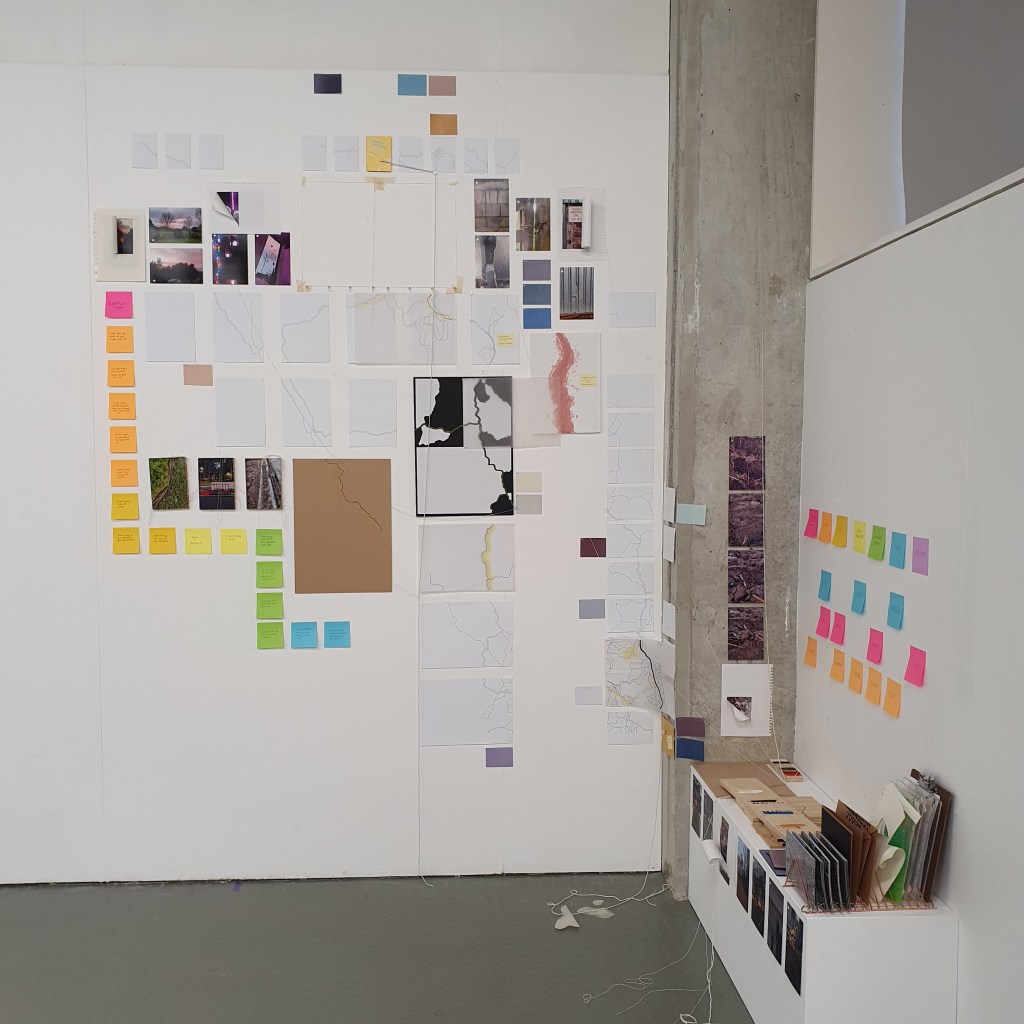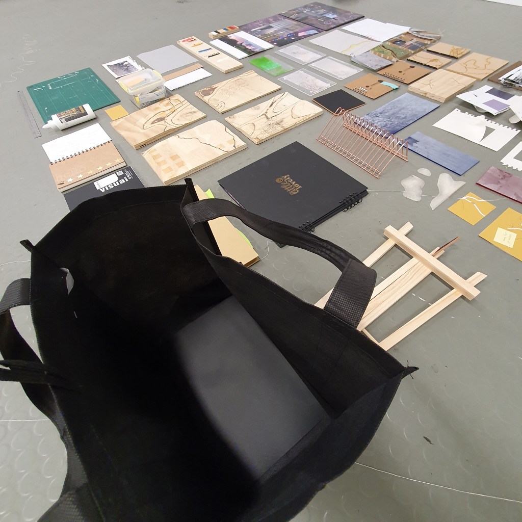 Attacking my uninstall with the idea of taking away the sub themes and sub ideas first to leave the overall main ideas so that they can speak for themselves. This began to be more of a task than i had first envisaged. As well as taking the work down from the wall and presentation space i had to somehow condense it down to fit back into the A4 sized (supermarket) bag that i had previously been using the transport my collection of work from space to space.