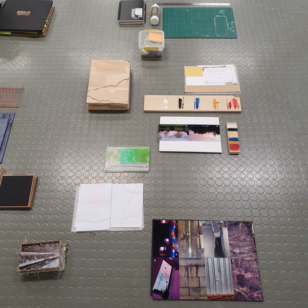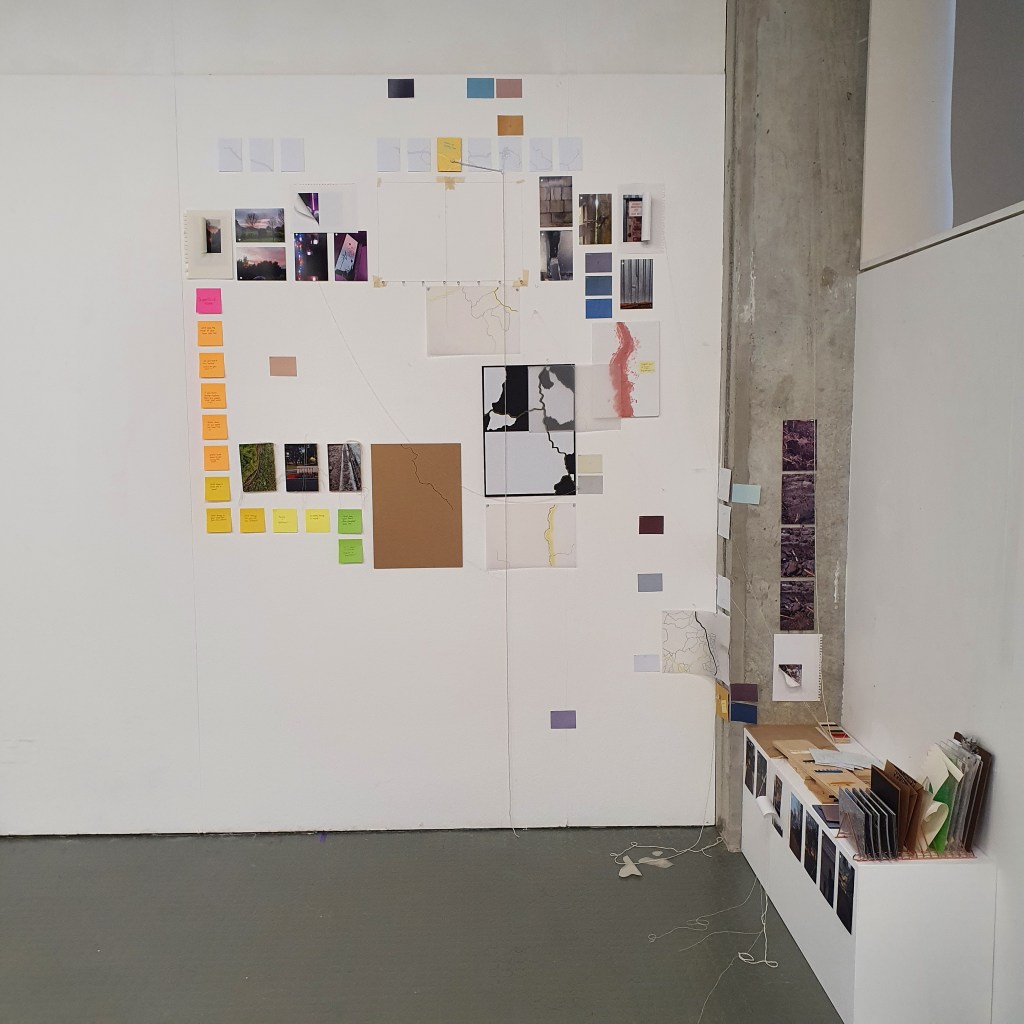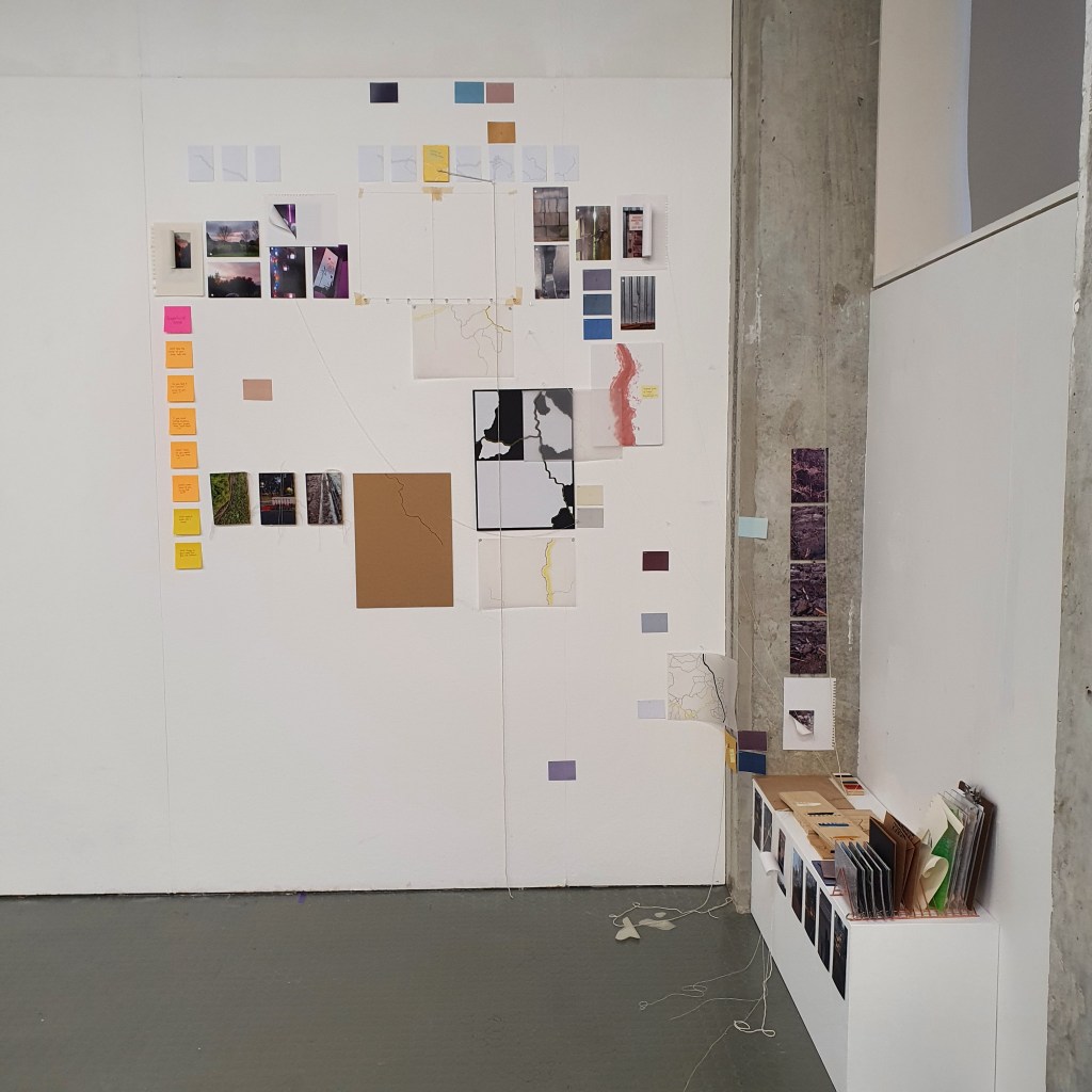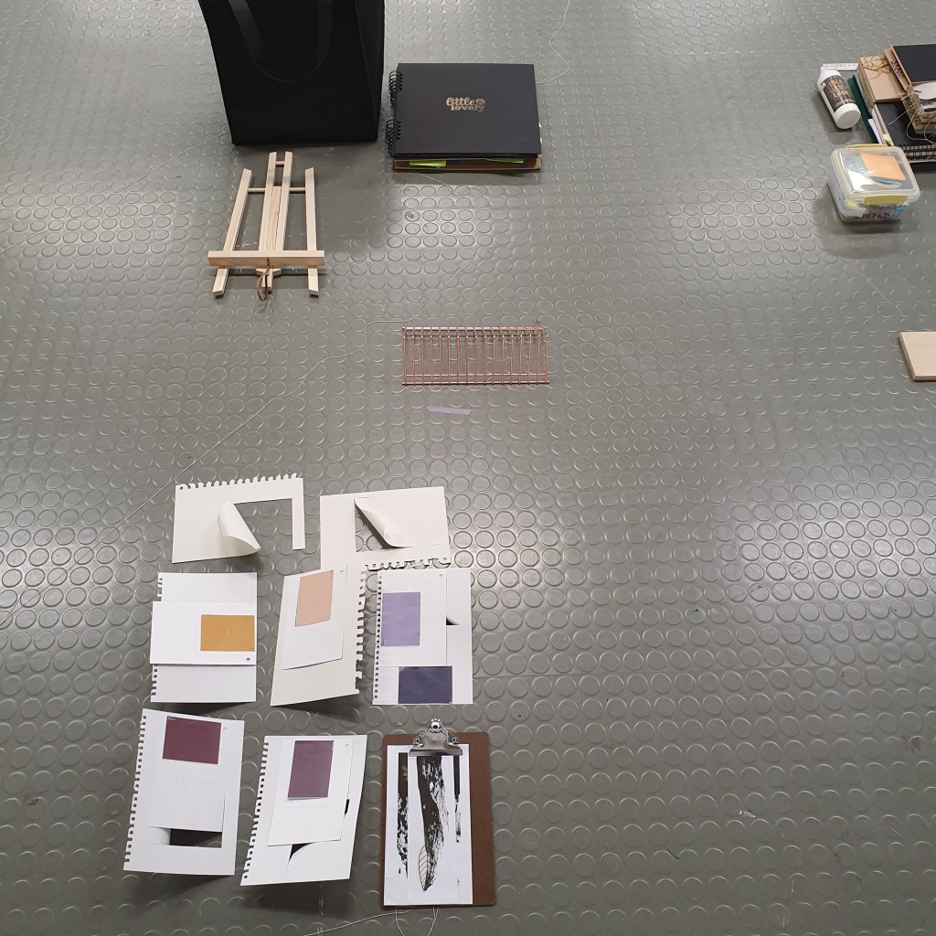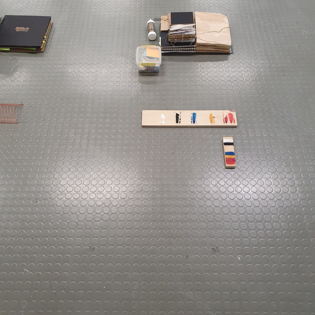 Pairing the work themes from the wall with themes that they did not connect to greately was a way that i could condense the work down without taking away its ability to be read at a later date. Sticking images and colour back to back t create little theme “packs”. and as the pieces got larger these packs began to be sides. one side of a borad would be one theme and when the board was flipped that theme was concealed and another theme was revealed, without the work having to be lost/forgotten.