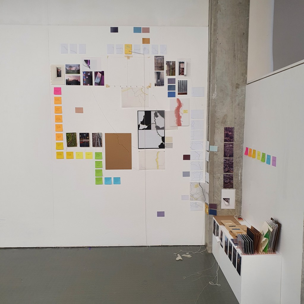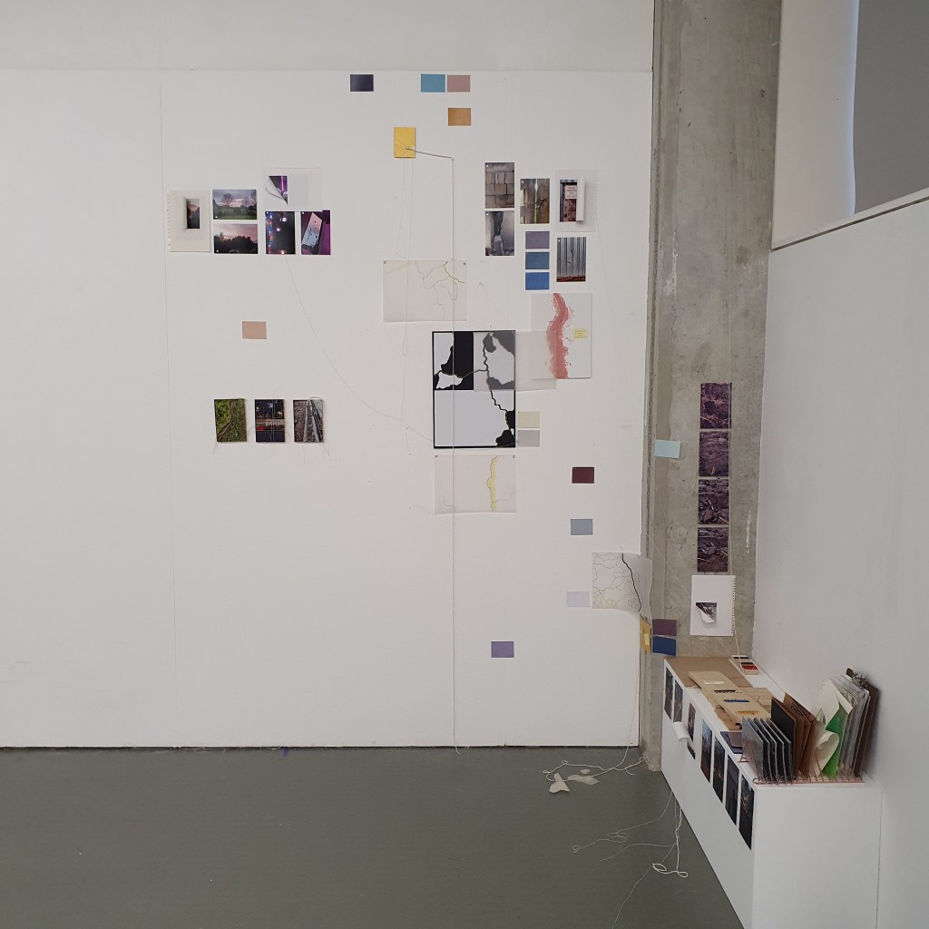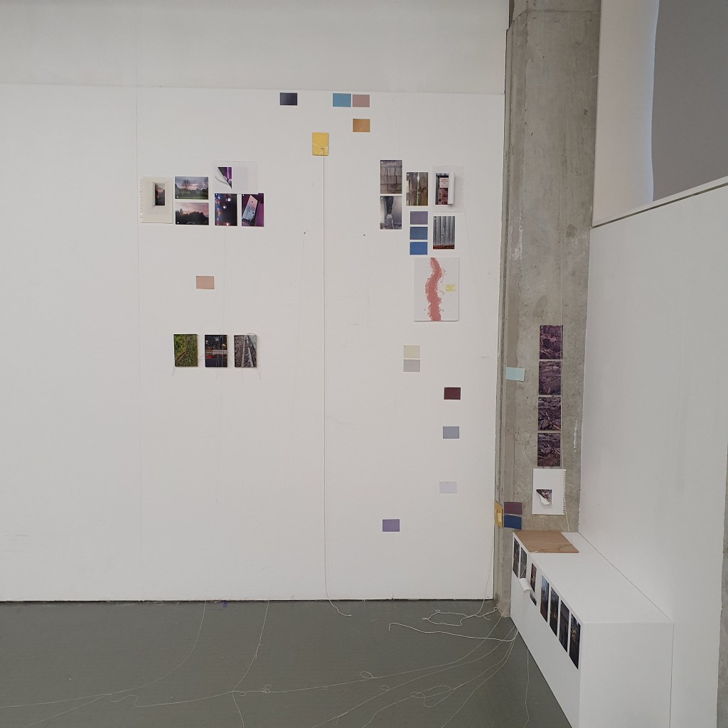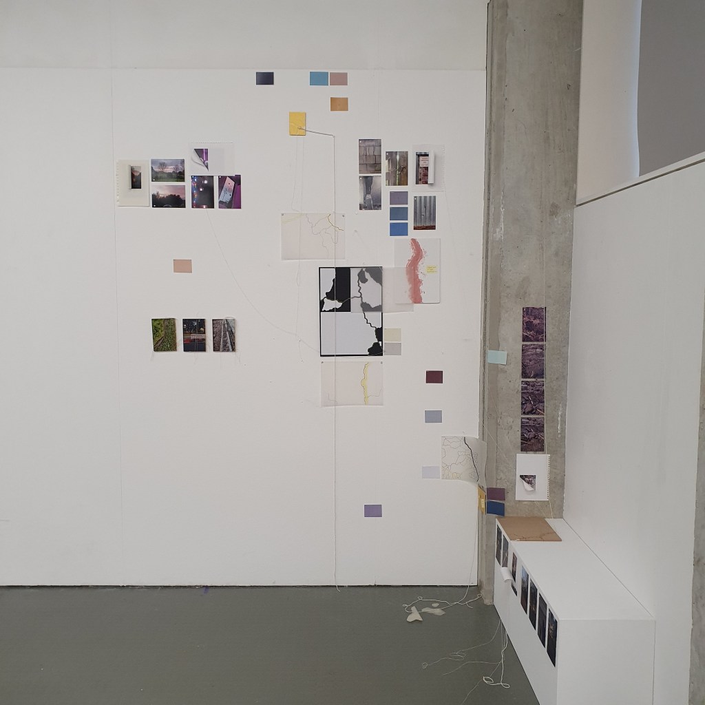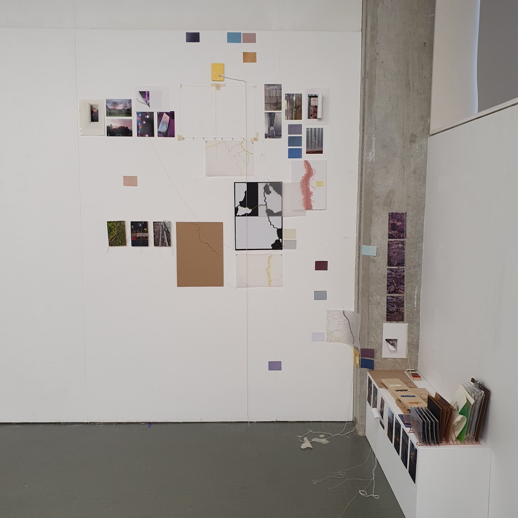 Pairing the work themes from the wall with themes that they did not connect to greately was a way that i could condense the work down without taking away its ability to be read at a later date. Sticking images and colour back to back t create little theme “packs”. and as the pieces got larger these packs began to be sides. one side of a borad would be one theme and when the board was flipped that theme was concealed and another theme was revealed, without the work having to be lost/forgotten.